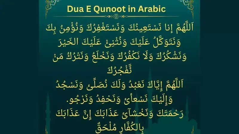 अल्लाहुम्मा इन्ना नस्तइनु क व नस्तग्फिरूक व नुअमिनु बि क व न तवक्कलु अलैक व नुस्नी अलैकल खैर व नशकुरुक वला नक्फुरू क व नख लओ व नतरूकु मंय्यफ्जुरू क अल्लाहुम्म इय्या क नअबुदू व लका नुसल्ली व नस्जुदू व इलैक नसआ व नहफिदु व नरजु रहमत क व नख्शा अजा इन्न अजा ब क बिल कुफ्फारि मुल्हिक